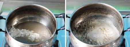 1:先把鍋刷干凈,在鍋里放入糖后,倒入30克冷水;將鍋用小火加熱。隨著熱度上升,糖會漸漸溶解,并開始冒出小泡,加熱的過程中不需要攪拌,切記!